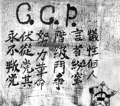 “犧性(牲)個人,言(嚴)首(守)秘(注:秘錯)蜜(密),階級斗爭,努力革命,伏(服)從(注:從錯)黨其(紀),永不叛黨。”