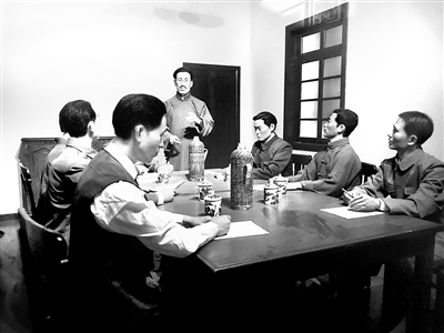 圖5:圖為1927年5月10日,中央監察委員會成員召開會議的模擬場景。站立者為王荷波,其右手起逆時針依次為:楊匏安、張佐臣、劉峻山、蔡以忱、楊培森、周振聲、許白昊。蕭石月、阮嘯仙沒有參加會議。